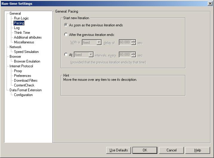 Pacing Pacing is, as its name suggests, a method to pace your requests. You do this so you can accurately achieve a desired load against your system instead of just mindlessly hammering it. Pacing is the time that the vuser waits for between iterations. Pacing is particularly useful in controlling the number of iterations in a specified time. Let us suppose, we know that to complete an iteration a vuer takes an avg. time of v sec and the test requirement says that a vuser should complete only 10 iterations in an hour. So in above case, the vuser should iterate once in minimum 360 sec. if v is less than 360, pacing is added to adjust iteration time. So pacing (p) is selected such that v+p = 360. In this way the vuser will roughly iterate 10 times in an hour. Why Use Pacing? Without pacing you will never know if the problems you find are really problems or not. You could waste everyone's time tuning a system to handle a billion hits per second when in reality when it went live it only needed to able to handle 5 and it could have done that from the start. Pacing Setting Pacing can be set tin the run time settings for the script. To view run time settings press F4 key or go to Vuser -> Run-Time Settings and then select Pacing under General