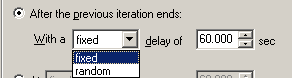 As soon as the previous iteration ends: With this option the vuser does not wait after an iteration, it immediately starts the next iteration. After the previous iteration ends: This option allows you to select fixed/random delay. Minimum delay (in seconds) is 0 and the maximum delay is 32000. With this option the vuser will always wait for the specified time before beginning the next iteration. We can introduce a random or fixed delay, by selecting the value form the dropdown shown below.